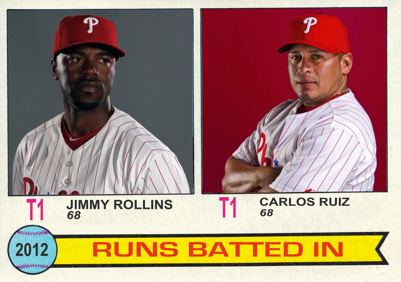 It was very much a down year all around for the offense as it took just 68 RBIs from Jimmy Rollins and Carlos Ruiz to lead the team. This is the first year since 2000 that the Phillies didn't have at least one player with 100 RBIs or more. The last time that few RBIs led the team was in the strike-shortened 1994 season when Darren Daulton had 56. Before that, we have to go back to Juan Samuel's team-leading 67 RBIs in 1988.