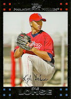 Lohse earned one Phillies baseball card in 2007 for his 13 games with the club - the Topps Update card featured here. The folks at Topps gave us an altered photo of Lohse wearing a Phillies spring training uniform, despite the fact that the pitcher never actually spent a spring with the club. He would appear in three more Phillies cards in 2008 - Topps Heritage, Upper Deck and Upper Deck First Edition - before the baseball card makers realized we Phillies collectors didn't need any more Lohse cards in our collections. Onward.